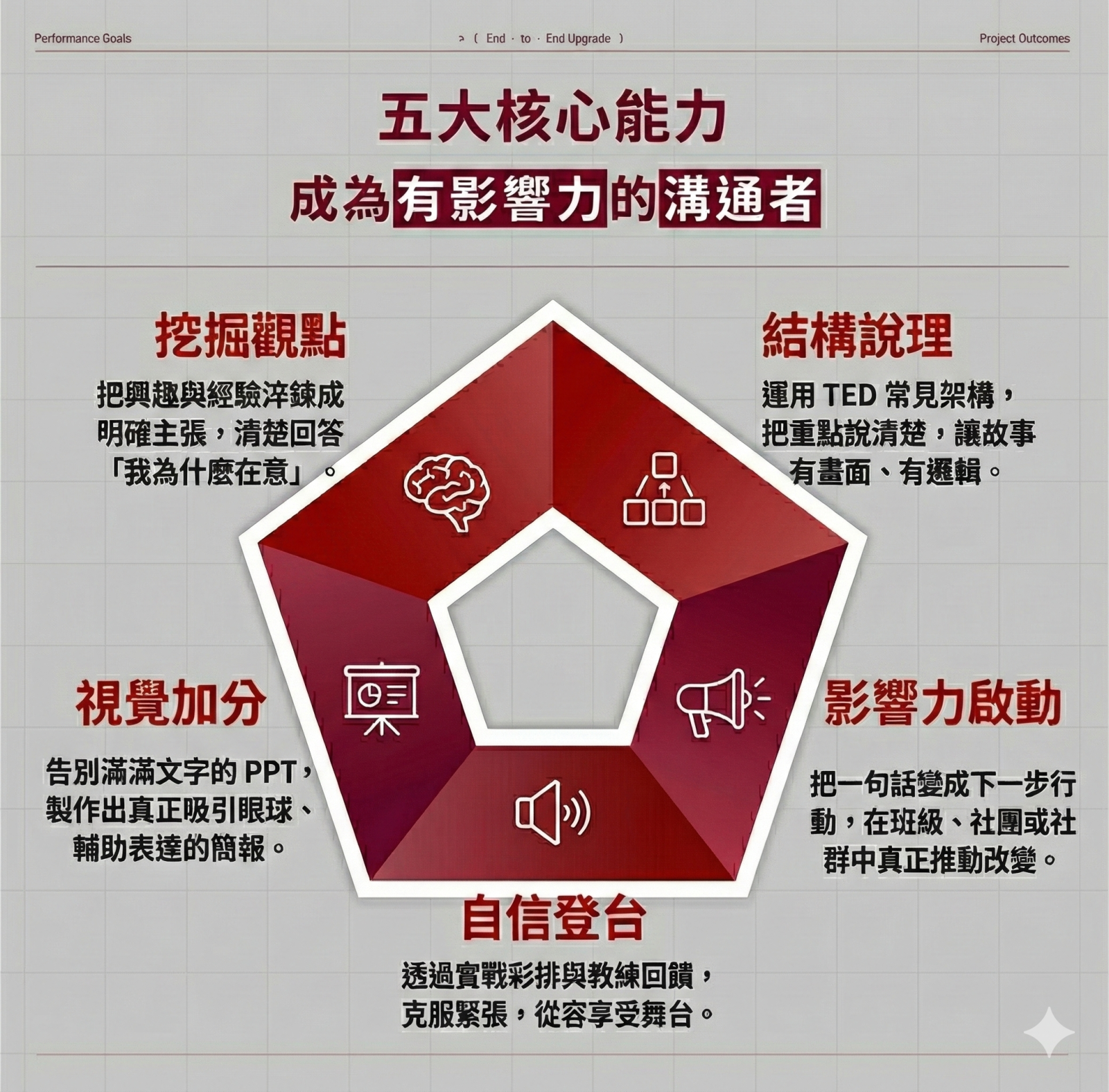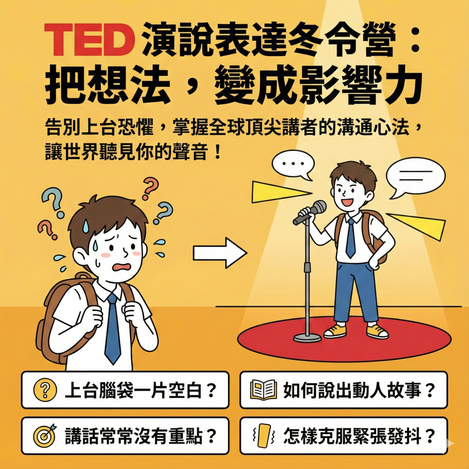 這是 TEDxTaichung 策展人與總監首度對外公開的學生實作營隊。我們不教死板的朗讀,而是用 TED 的方法,帶你經歷從「觀點挖掘」到「舞台呈現」的完整旅程。