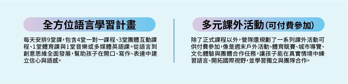 除了正式課程以外,營隊還規劃了一系列課外活動可供付費參加,像是週末戶外活動、體育競賽、城市導覽、文化體驗與團體合作任務,讓孩子能在真實情境中練習語言、開拓國際視野,並學習獨立與團隊合作。